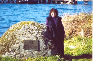 Author beside memorial to the Italians who landed at Jackson Bay, Westland, NZ in 1877 (2003)